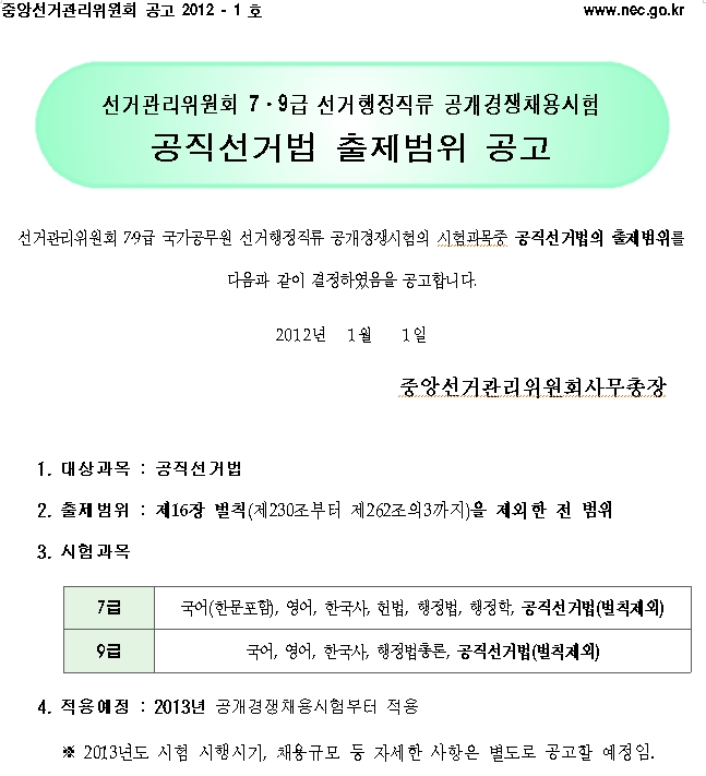 선거관리위원회 7․9급 선거행정직류 공개경쟁채용시험 공직선거법 출제범위 공고